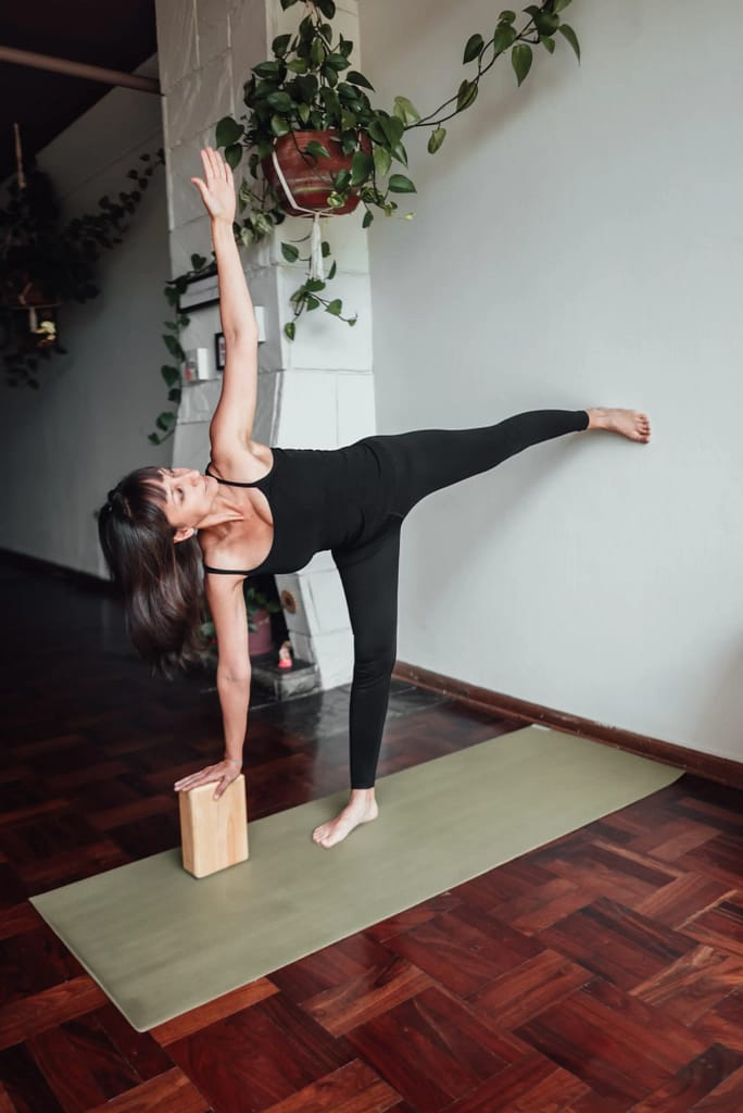 Posture de la demi-lune (Ardha Chandrasana)  : Placez un bloc à l’extérieur de votre pied avant et utilisez-le pour soutenir votre main. Cela aidera à stabiliser votre équilibre et à aligner correctement votre colonne vertébrale et vos hanches. Maintenez la posture pendant quelques respirations profondes, en vous concentrant sur l’ouverture de la poitrine et l’allongement des jambes.